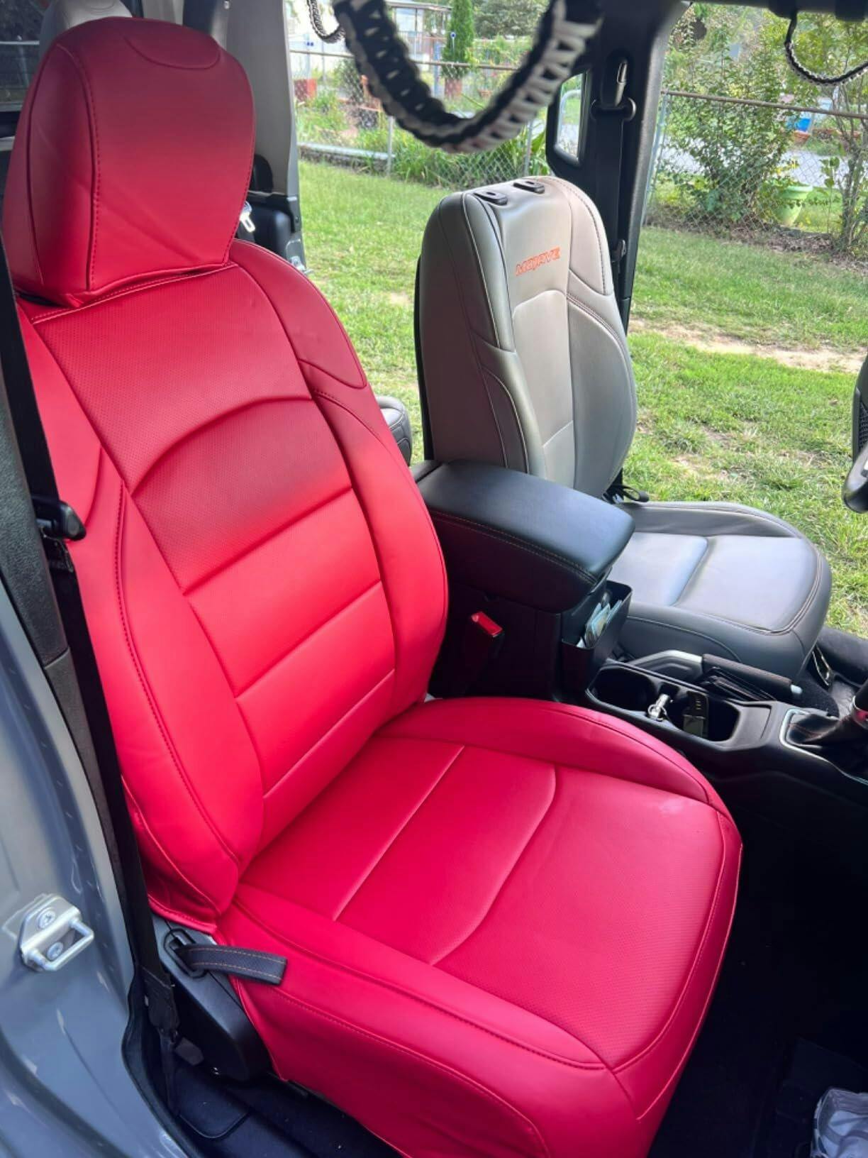 Ernesto Romero Good looking seats for a good price. Does not come with good instructions but easy to figure out. You do not loose middle seatbelt you just have to feed it through correctly. It does take sometime to install because they are fitted. The mojave seats are different than the other gladiator trims but fit good. I let them sit in the sun for a bit to loosen them up before install. Overall im highly satisfied with the covers. Need good grip strength to pull tight. Some patience and time. Use tool that it comes with to push leather behind plastic clips, knobs.