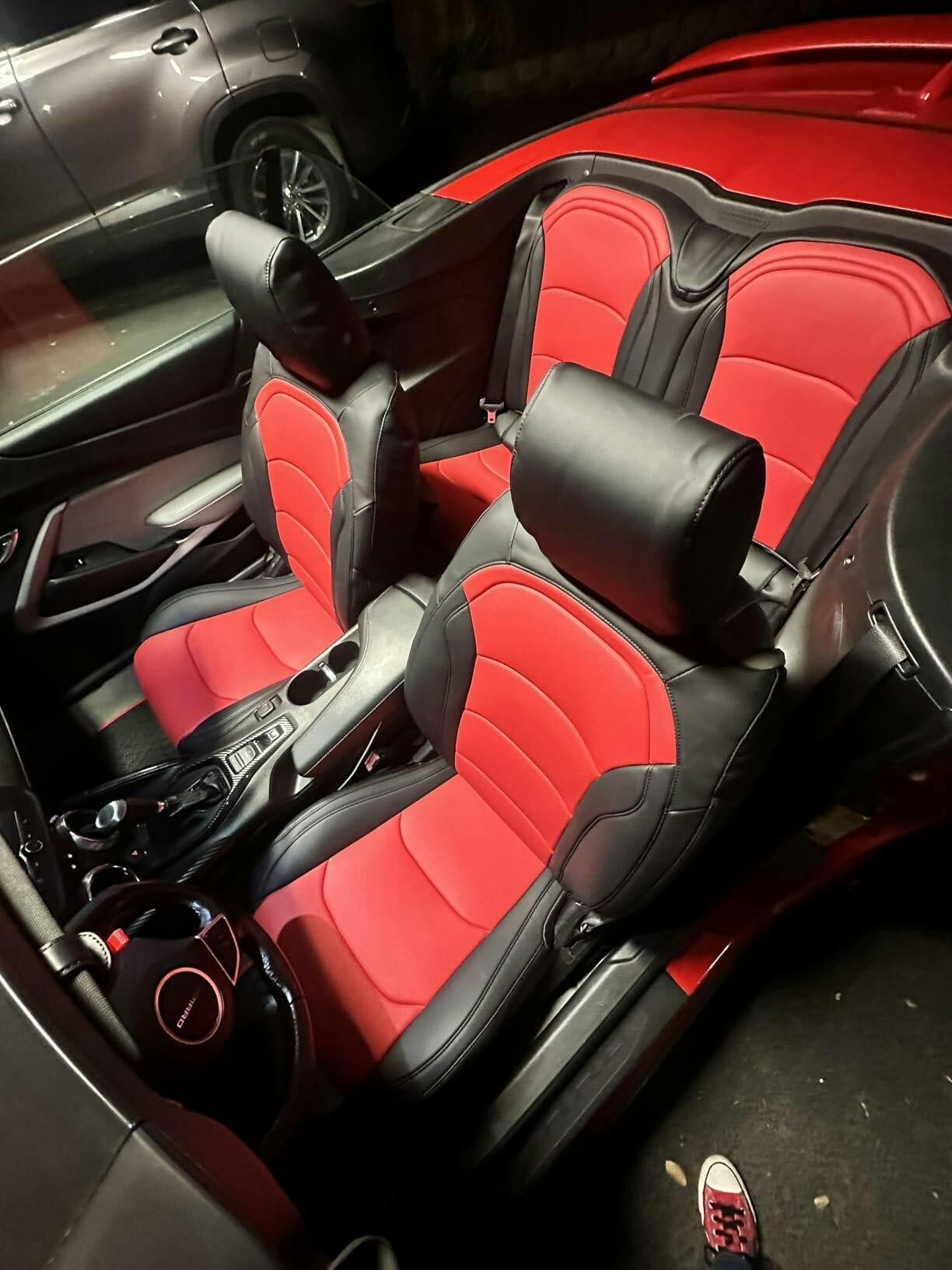 This 2020 Camaro RS looks fantastic! I only installed the front seats, and they fit perfectly! There's no odor. Excellent quality, highly recommended.